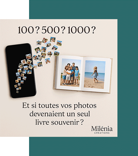 Milénia transforme vos photos en un livre cohérent, élégant et pensé pour durer. Vos souvenirs ne restent plus éparpillés dans vos téléphones : ils deviennent un objet précieux, à partager en famille et à transmettre.